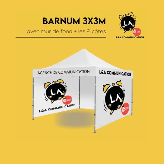 Chez L&A Communication, nous vous proposons des barnums avec structure pliante en aluminium et toile imprimée sur-mesure (toit, murs, fronton). Idéal pour les marchés, salons, inaugurations ou animations commerciales, ce support vous assure visibilité, confort et impact visuel fort.