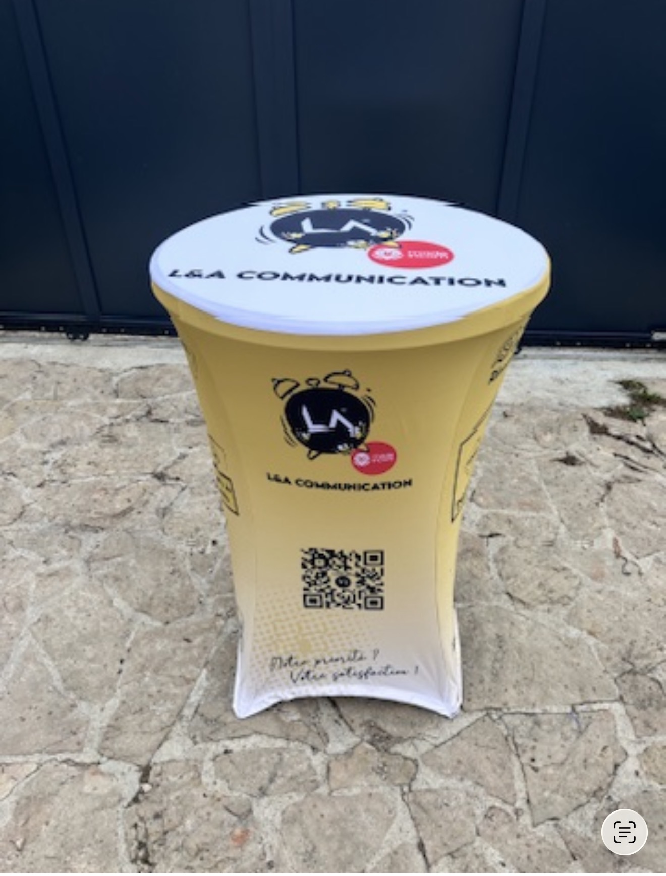 Créez un espace accueillant et professionnel avec un mange-debout personnalisé à votre image. Chez L&A Communication, nous vous proposons ce support incontournable du mobilier événementiel, idéal pour vos salons, cocktails, animations commerciales ou points d’accueil à Lyon, Bourg-en-Bresse ou Saint-Étienne.