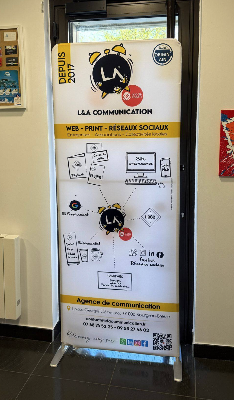 Chez L&A Communication, nous réalisons des totems sur mesure avec visuel textile tendu sur structure aluminium démontable. Facile à monter, transporter et stocker, il allie esthétique professionnelle et praticité.